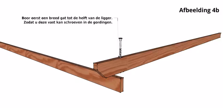 Boor eerst een breed gat tot de helft van de ligger. Zodat u deze vast kan schroeven in de gordingen.