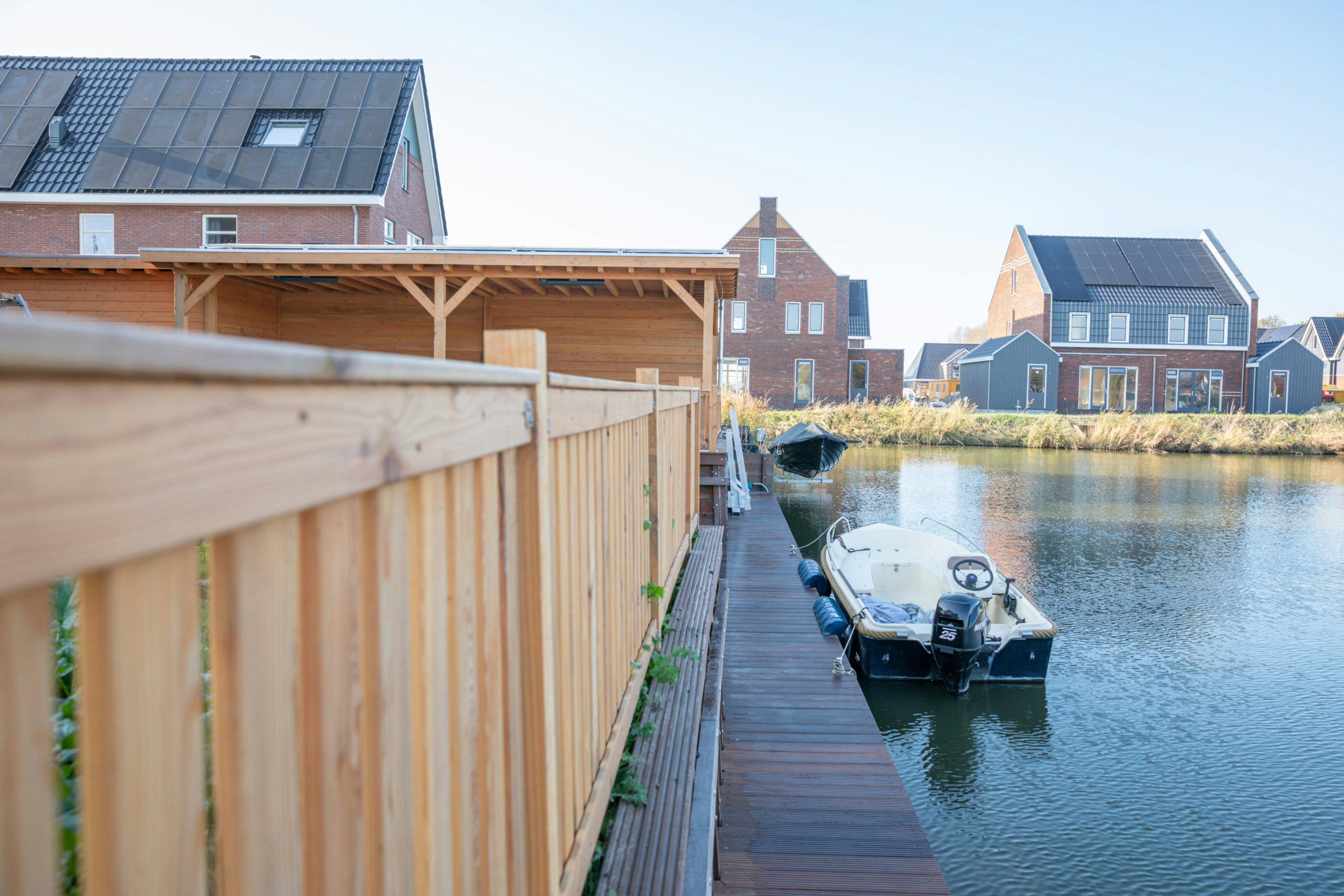 Roy’s tuin grenst aan het water en daar kan hij nu extra van genieten dankzij de hardhouten damwand en hardhouten vlonder dat hij heeft geplaatst. Nu kan hij gemakkelijk zijn boot aanmeren, of gewoon even aan het water zitten. Het vlonder is afgebakend met een Douglas hekwerk. In de hoek van zijn tuin heeft hij daarnaast een overkapping geplaatst, gemaakt van Douglas. Zo kan hij heerlijk onder de overkapping over het water uitkijken. Genieten!