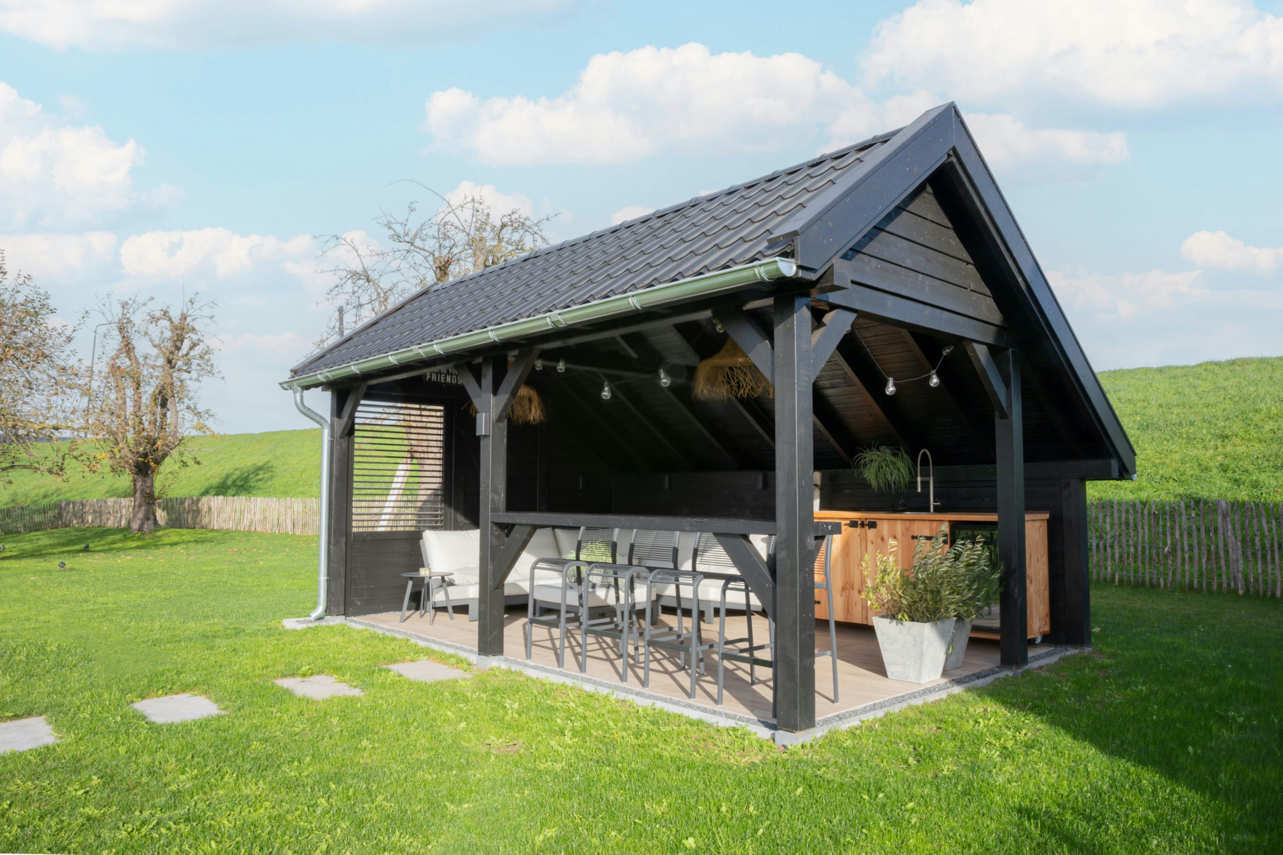 Een plek om even tot rust te komen of gezellig samen te borrelen met vrienden; deze kapschuur van Westwood biedt een oasis van rust en ontspanning! Deze overkapping is gemaakt van Douglas en heeft een zwart gespoten constructie en wanden, maar voor je eigen model is dit naar wens in te vullen. De overkapping is afgewerkt met een dakgoot en geplaatst op betonpoeren.